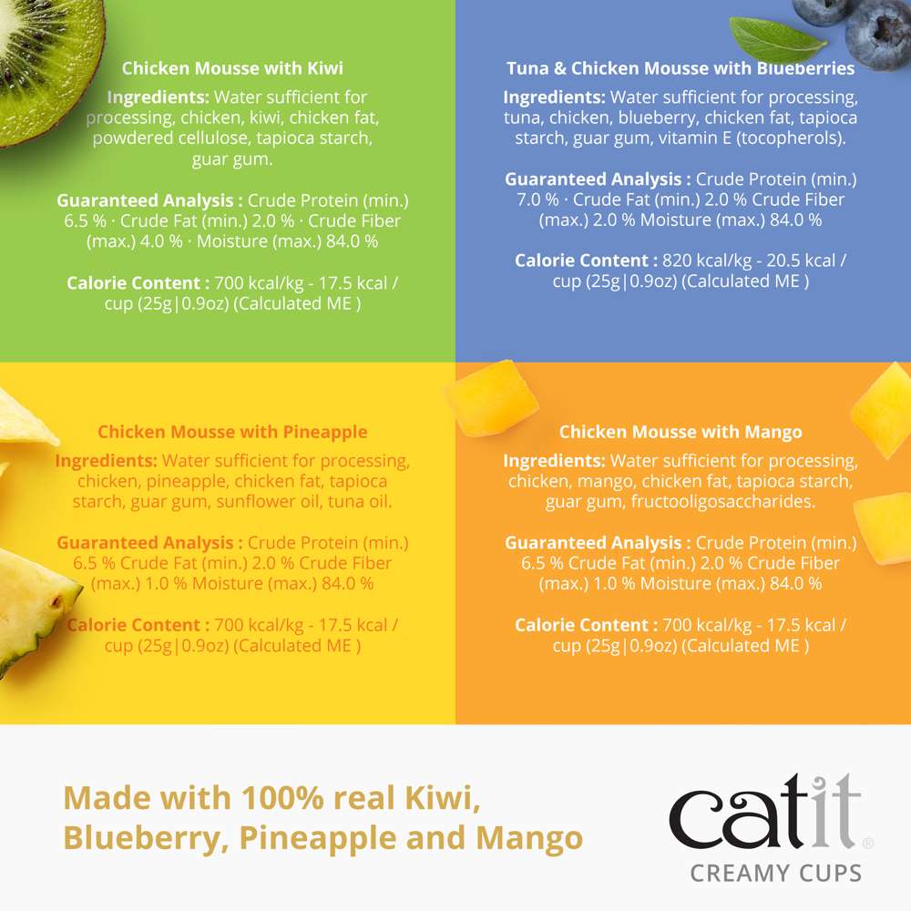 Catit Creamy Cups are available in 4 delicious flavors: Chicken Mousse with Mango, Chicken Mousse with Pineapple, Chicken Mousse with Kiwi, and Tuna & Chicken Mousse with Blueberry. Not sure which flavor your cat will prefer? Try them all with the Catit Creamy Cups Variety Pack.