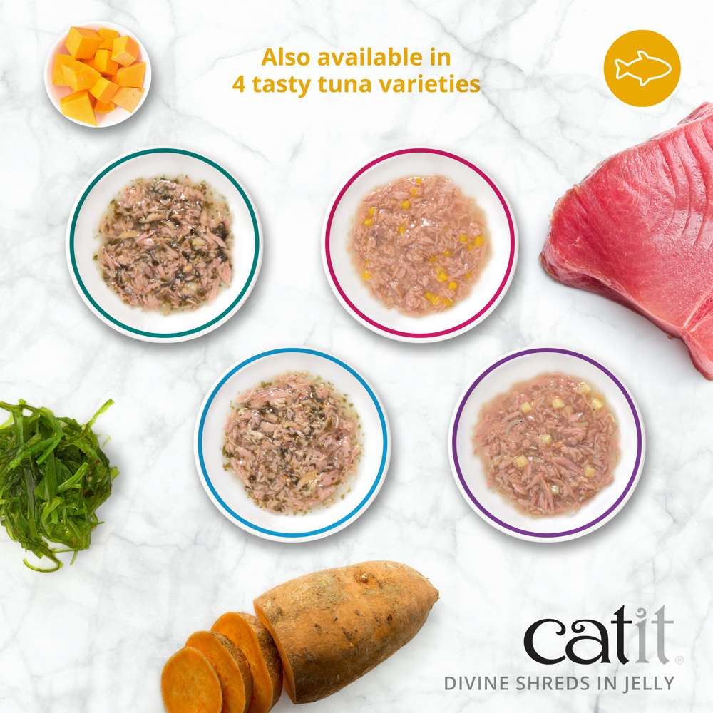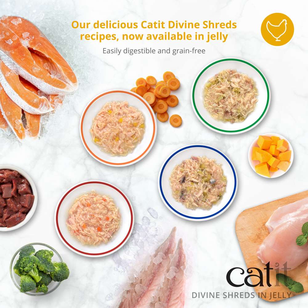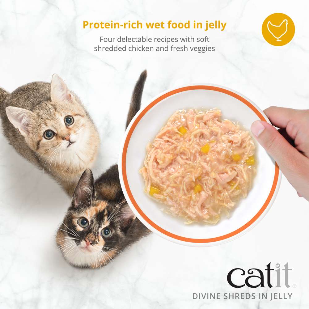Catit Divine Shreds are scrumptiously tender shreds of chicken or tuna with flavorful veggies, served in jelly.