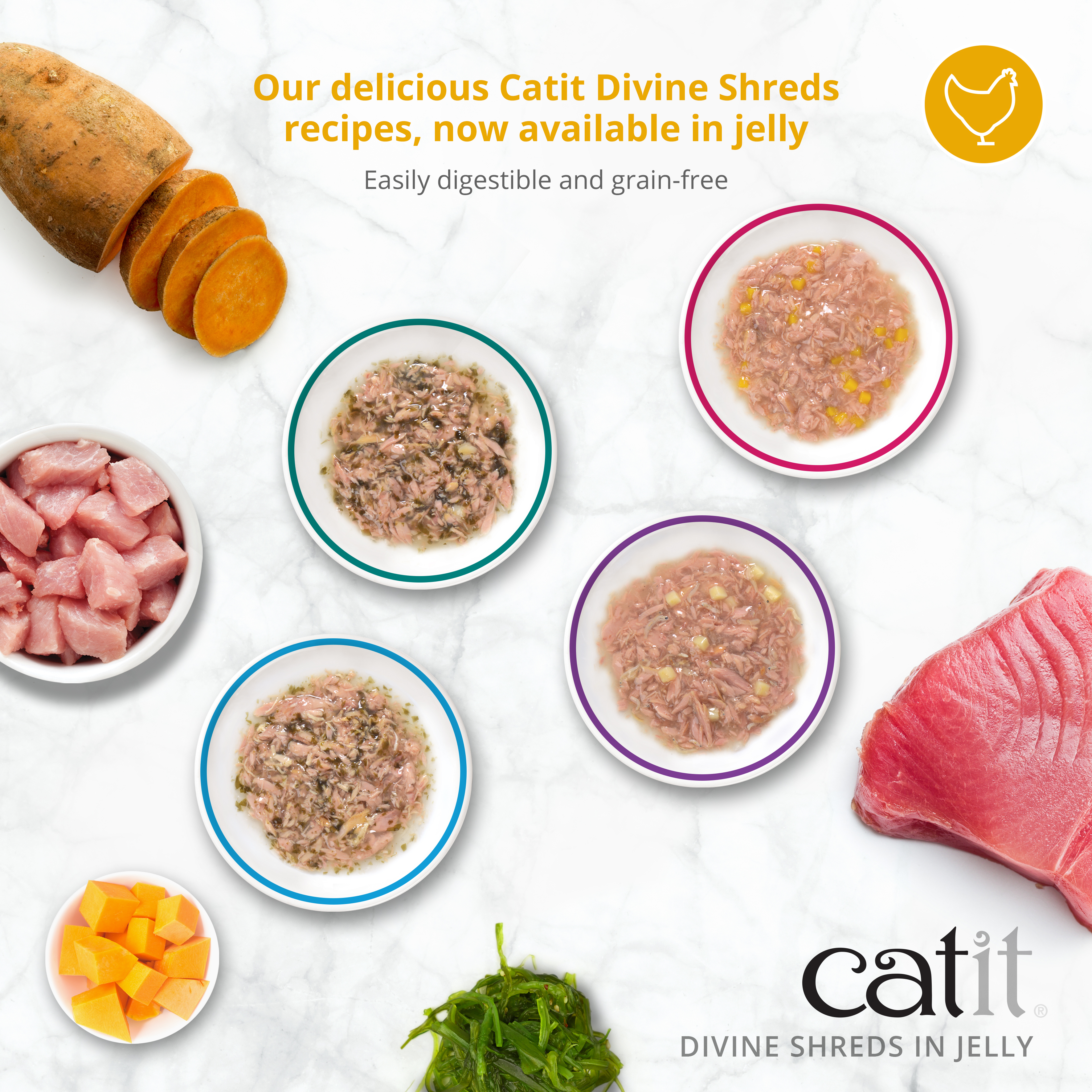 Catit Divine Shreds are scrumptiously tender shreds of chicken or tuna with flavorful veggies, served in jelly.