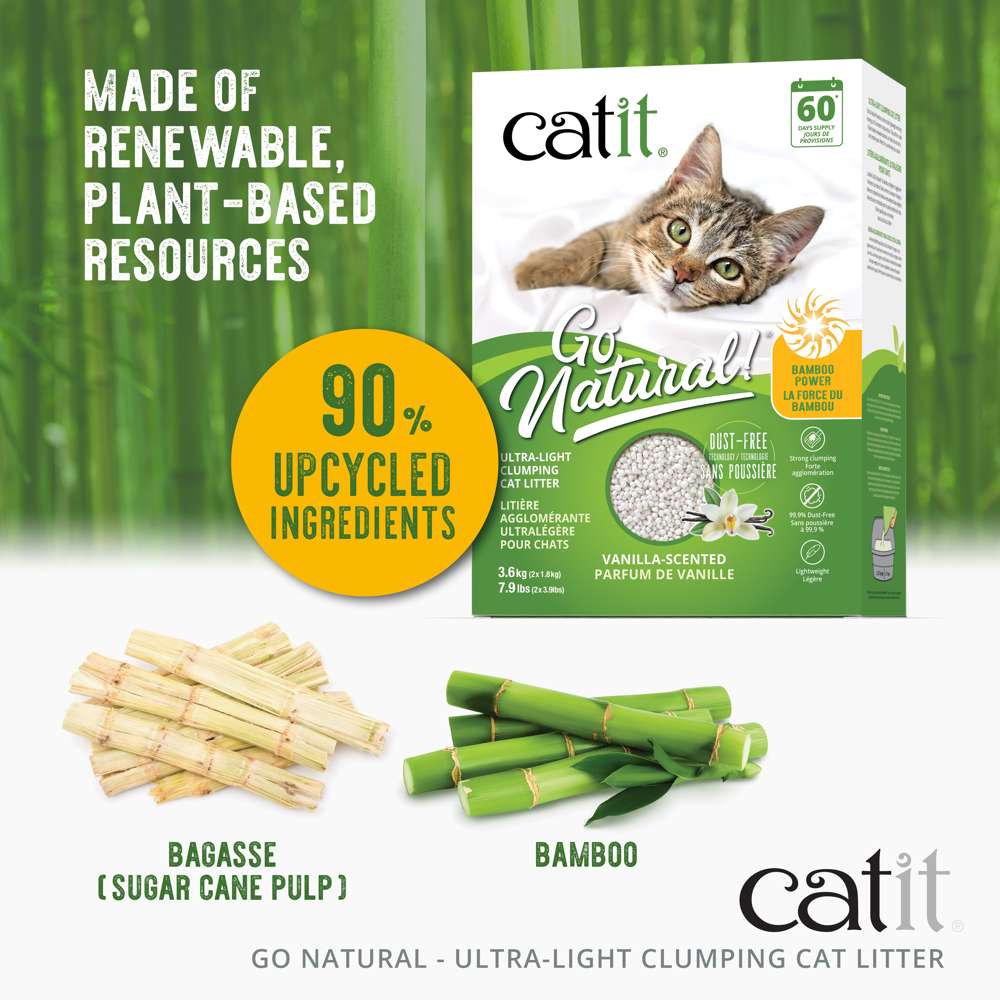Say hello to your new all-time favorite, strong-clumping cat litter. Catit Go Natural! Ultra-Light Litter is made of a mixture of natural bamboo fibers and sugar cane pulp (also known as bagasse), both upcycled post-consumer materials.